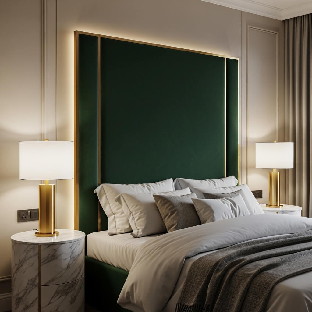 I recently helped my friend redesign her main bedroom, and we went with a deep emerald velvet headboard with brushed gold trim. The combination is seriously stunning against her cream walls. What makes this style work so well is the contrast between the soft, plush texture and the crisp metallic edge.