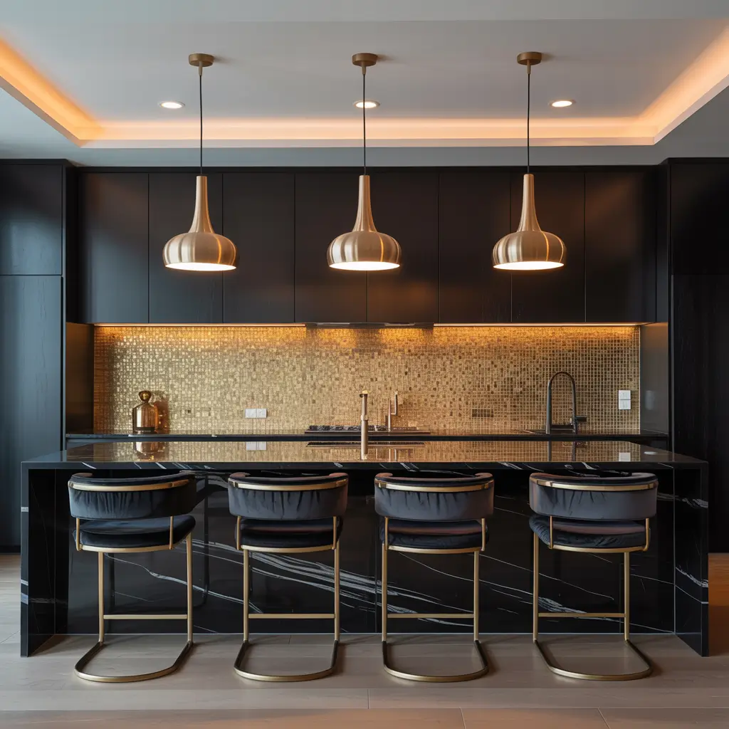Want to know what stops people in their tracks? A gold backsplash against black cabinets. Not subtle, not understated, just pure “look at my gorgeous kitchen” energy.