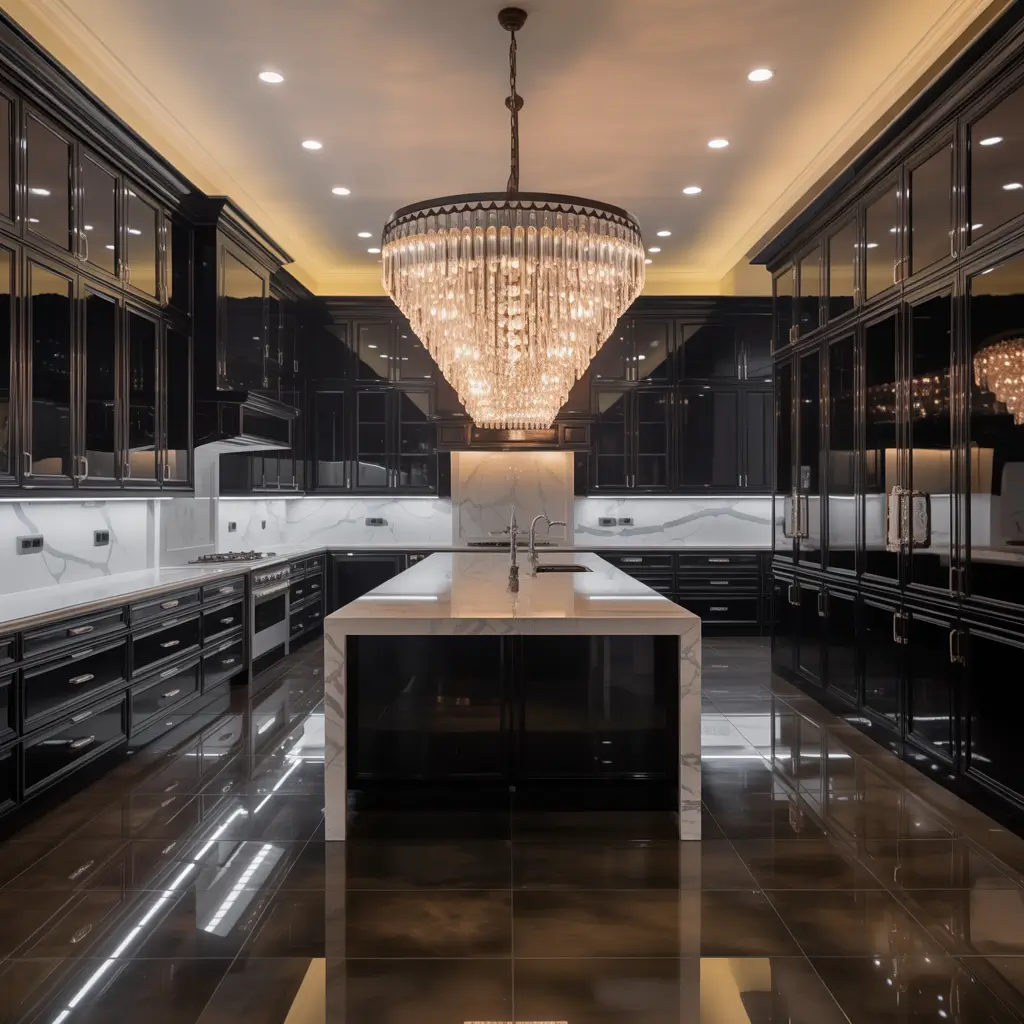 My neighbor installed this massive crystal chandelier over her black marble island, and now her kitchen looks like it belongs in a boutique hotel. The contrast between delicate crystal and bold black surfaces? Chef’s kiss.
