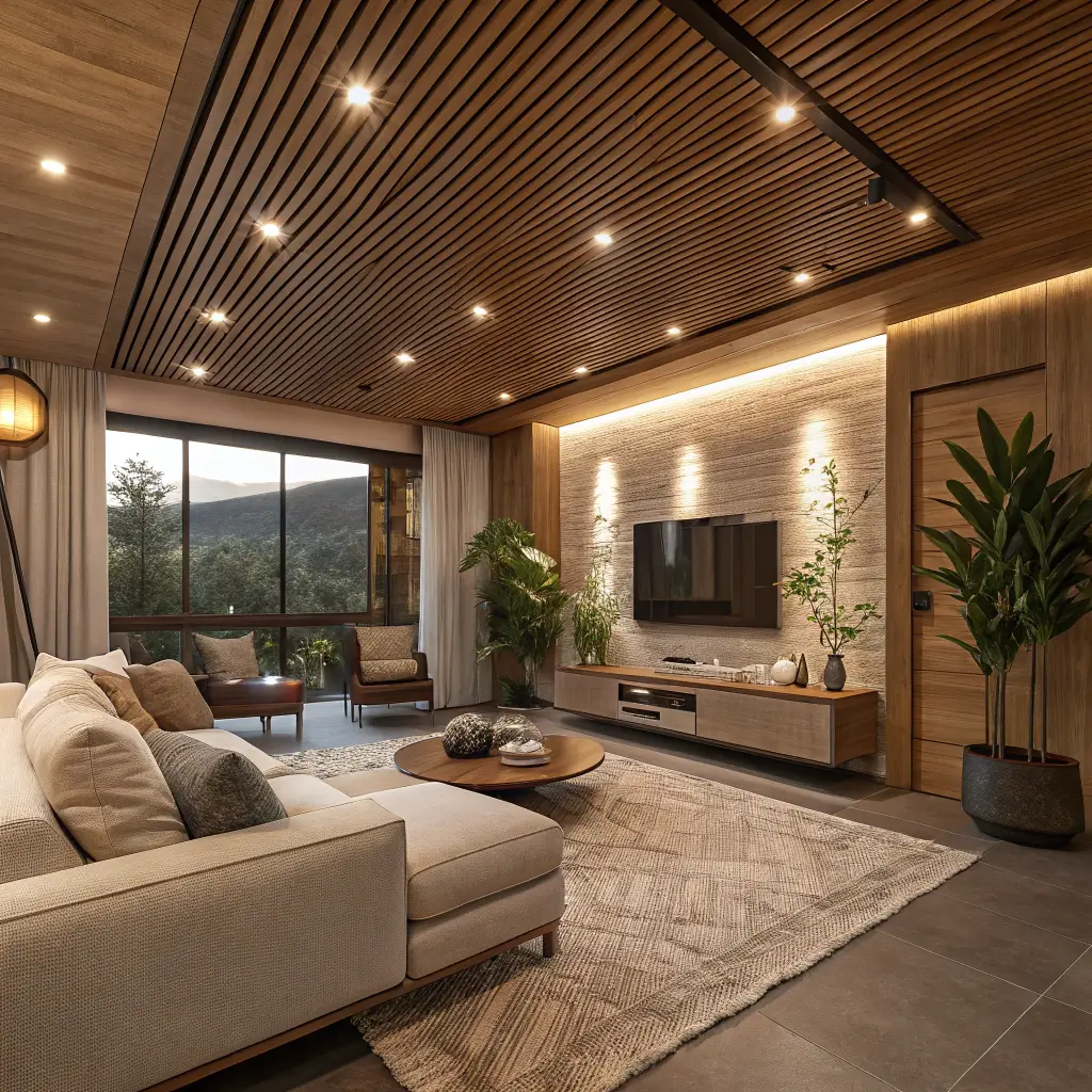 4. Wooden Slat Ceiling with Warm Ambient Lighting