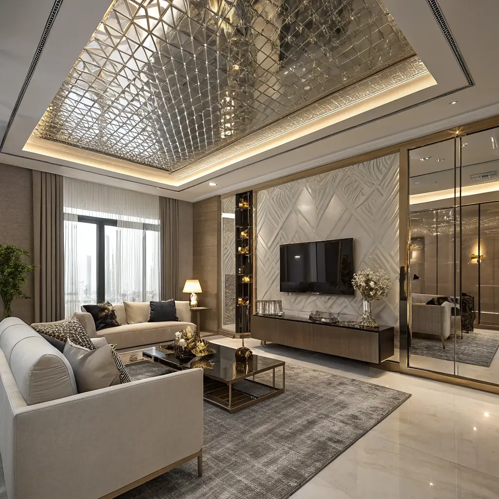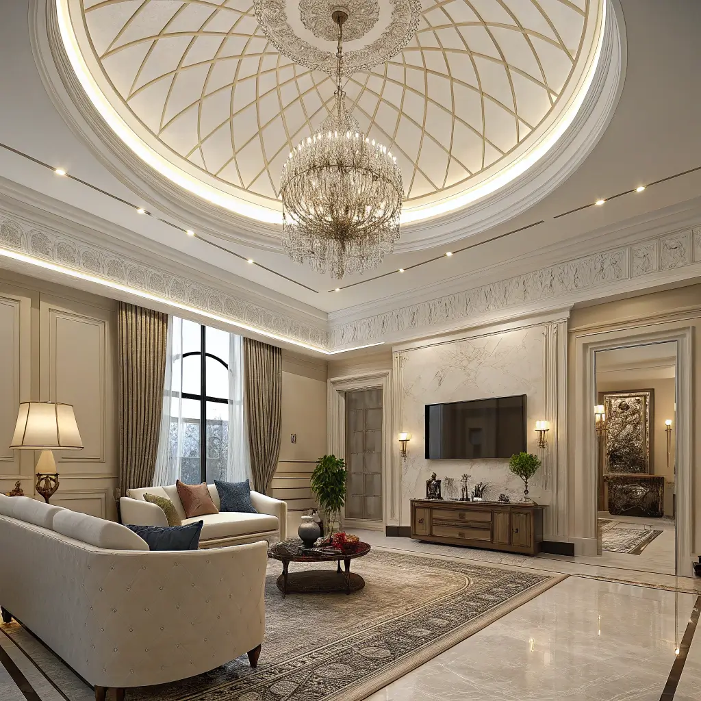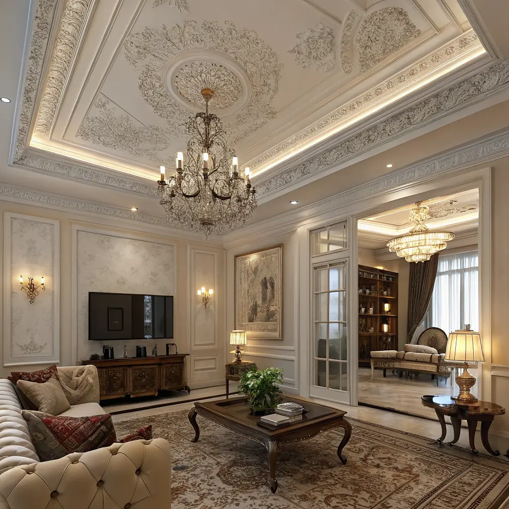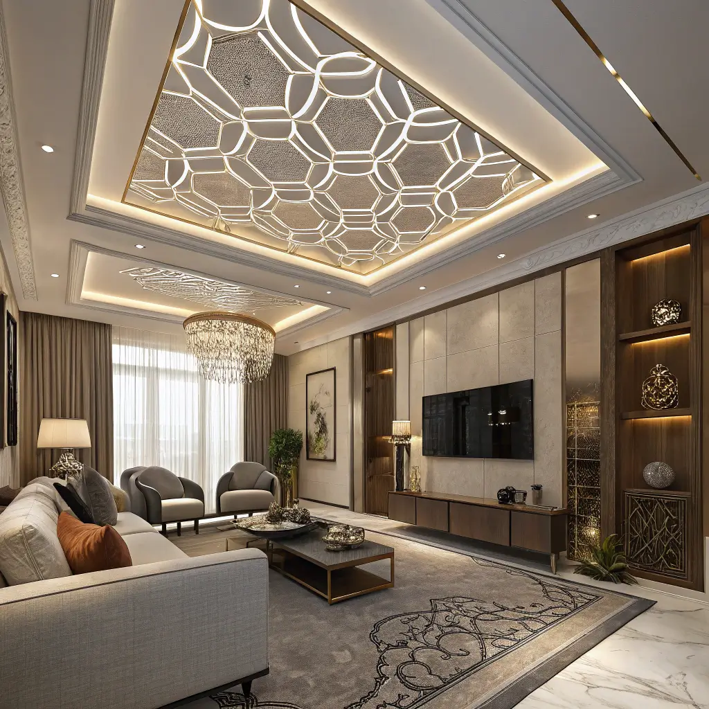 Minimalist luxury proves that less really can be more when executed perfectly. My living room features clean gypsum planes with recessed linear LED channels creating geometric patterns of light. It’s architectural jewelry – simple, elegant, and undeniably expensive-looking.