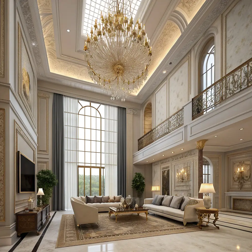 The key to luxury double-height ceilings lies in how you treat that vertical space. Empty height feels vacant. Properly designed height feels majestic. My chandelier fills the vertical space while architectural details prevent that warehouse feeling.