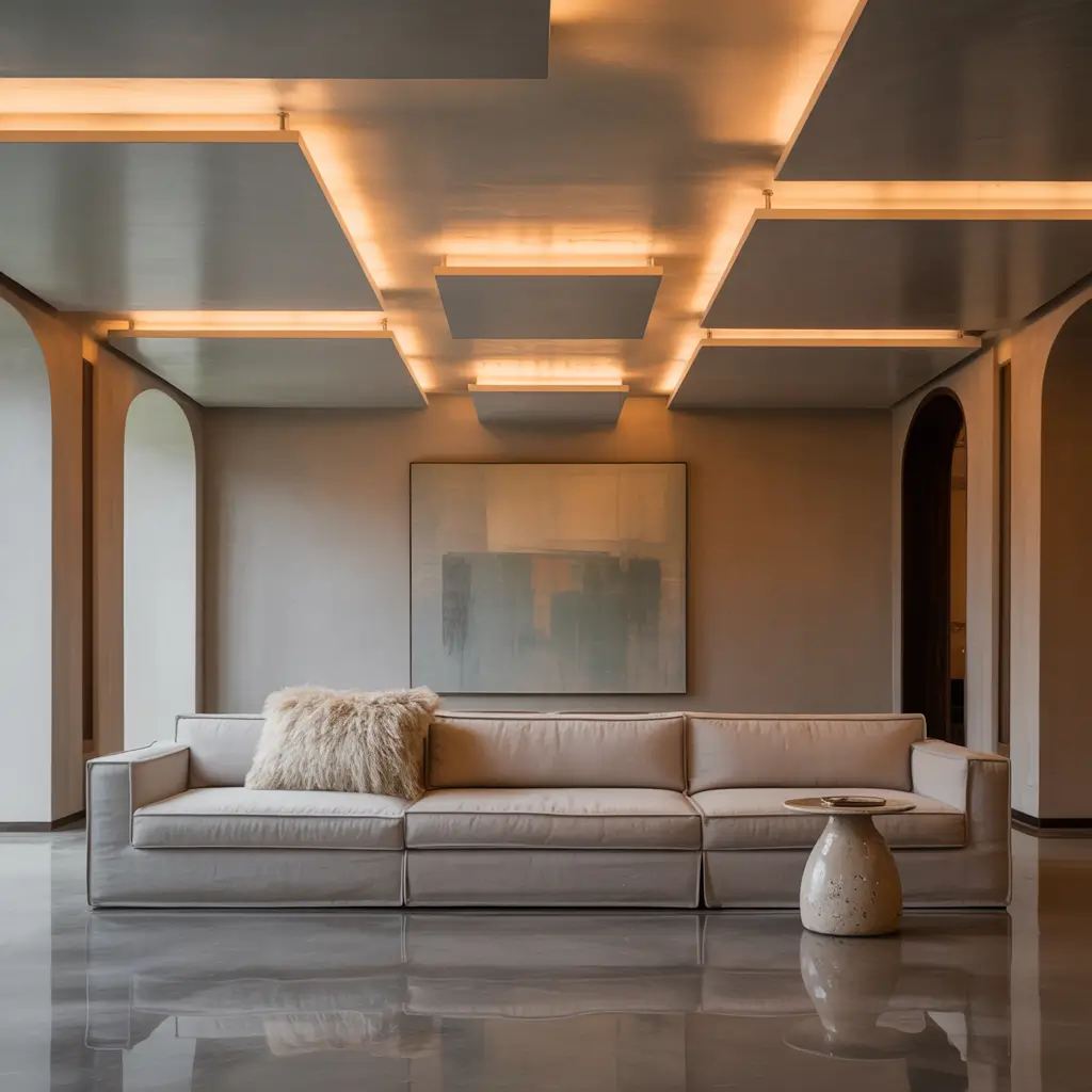 Floating panel ceilings create architectural interest that feels both modern and luxurious. My open-concept living area features three floating panels at different heights, each defining a specific zone while maintaining visual flow.