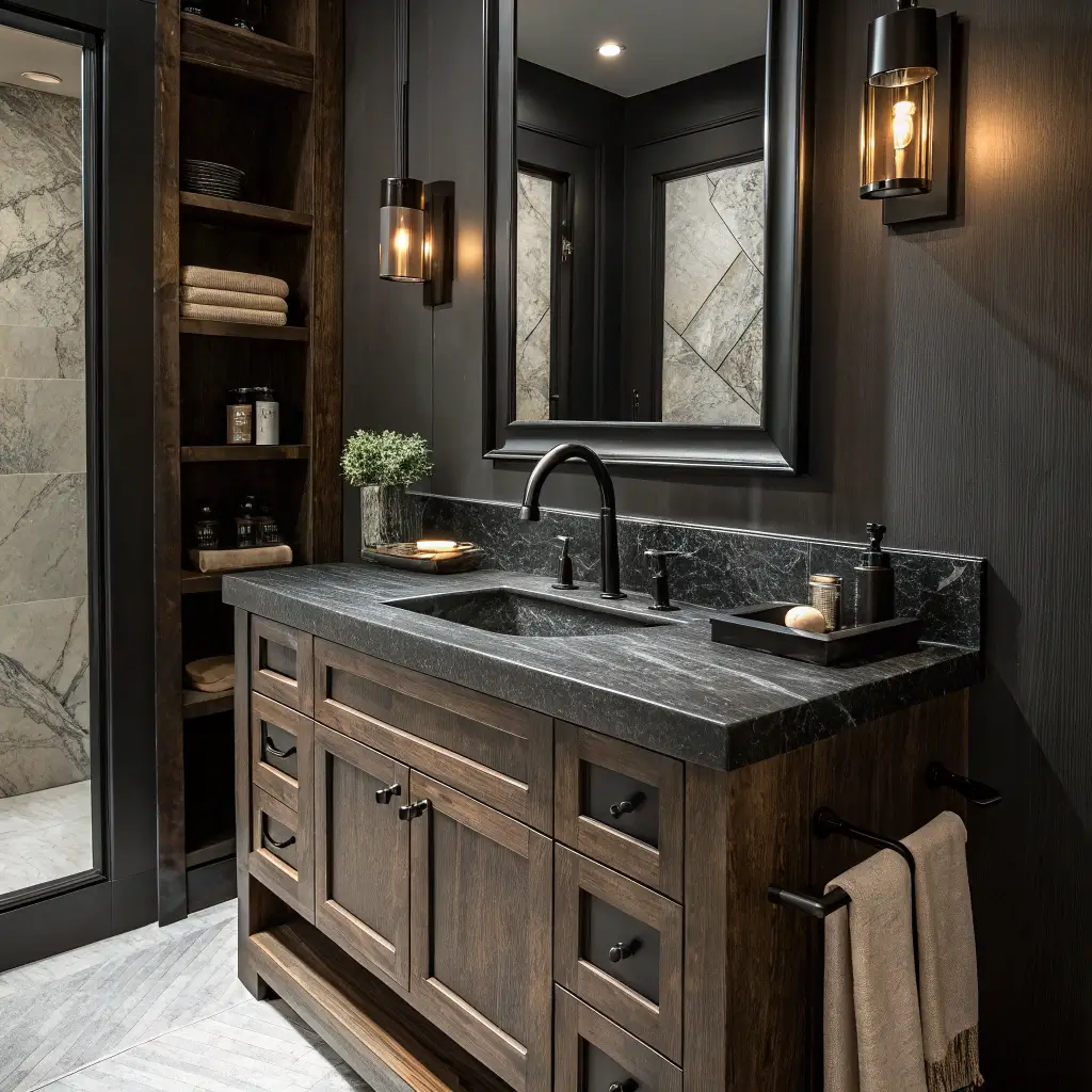 Who decided bathrooms need to be white and bright? Not me. My guest bathroom rocks a black marble sink with matte black everything, and FYI, it’s the most photographed room in my house. Black marble creates instant sophistication that white marble just can’t match.