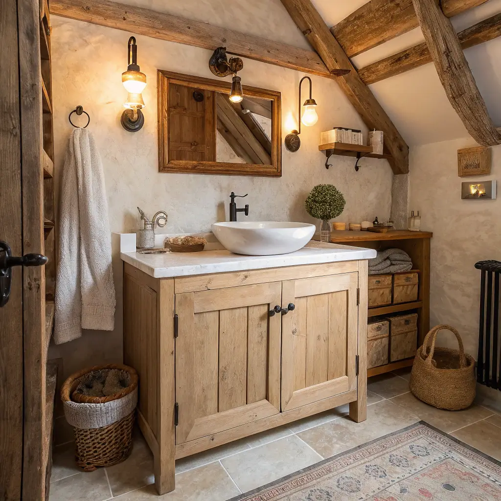Talk about a match made in design heaven! Combining rough-hewn wood with polished marble creates this amazing tension that makes people stop and stare. I discovered this combination accidentally when I couldn’t afford a full marble vanity but had salvaged an old barn wood cabinet.
