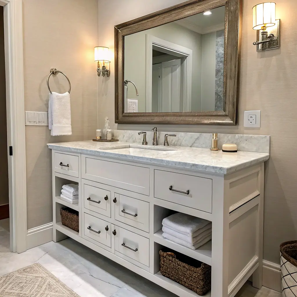 Built-in drawers beneath marble countertops offer hidden storage while maintaining clean lines. Soft-close drawers prevent marble-rattling slams (learned that one the hard way). Internal organizers keep toiletries sorted and accessible.