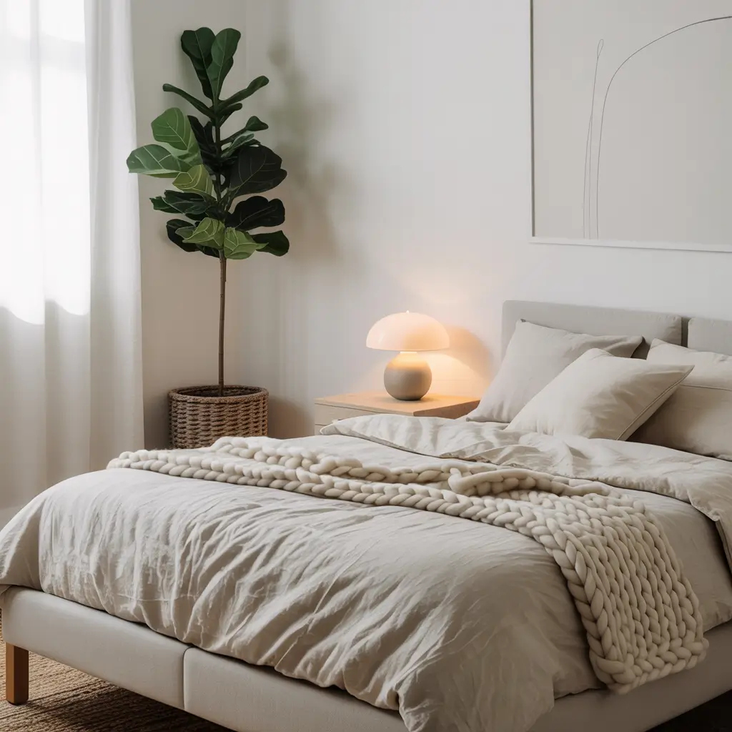 The secret to cozy minimalism? Texture over decoration. That chunky knit blanket adds more warmth than ten pieces of wall art. Focus on how things feel, not just how they look.
