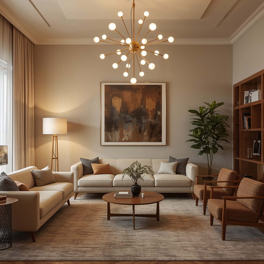 Lighting can make or break your mid century modern living room. Ever walked into a space with harsh overhead lighting and felt like you’re in an interrogation room? Yeah, that’s not the vibe we’re going for.