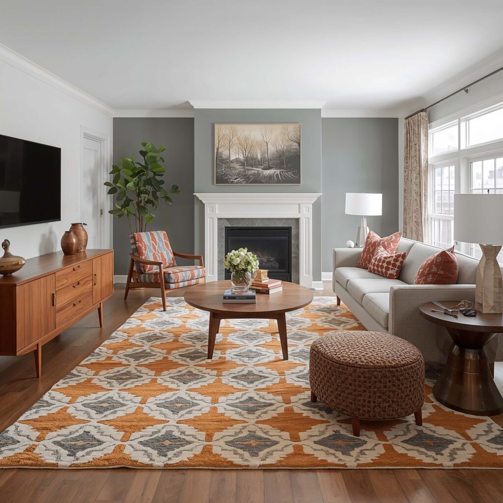 My current rug features an abstract pattern in burnt orange and cream. Does it make a statement? Absolutely. But it also ties together all the warm wood tones in my space while adding that essential pop of color.