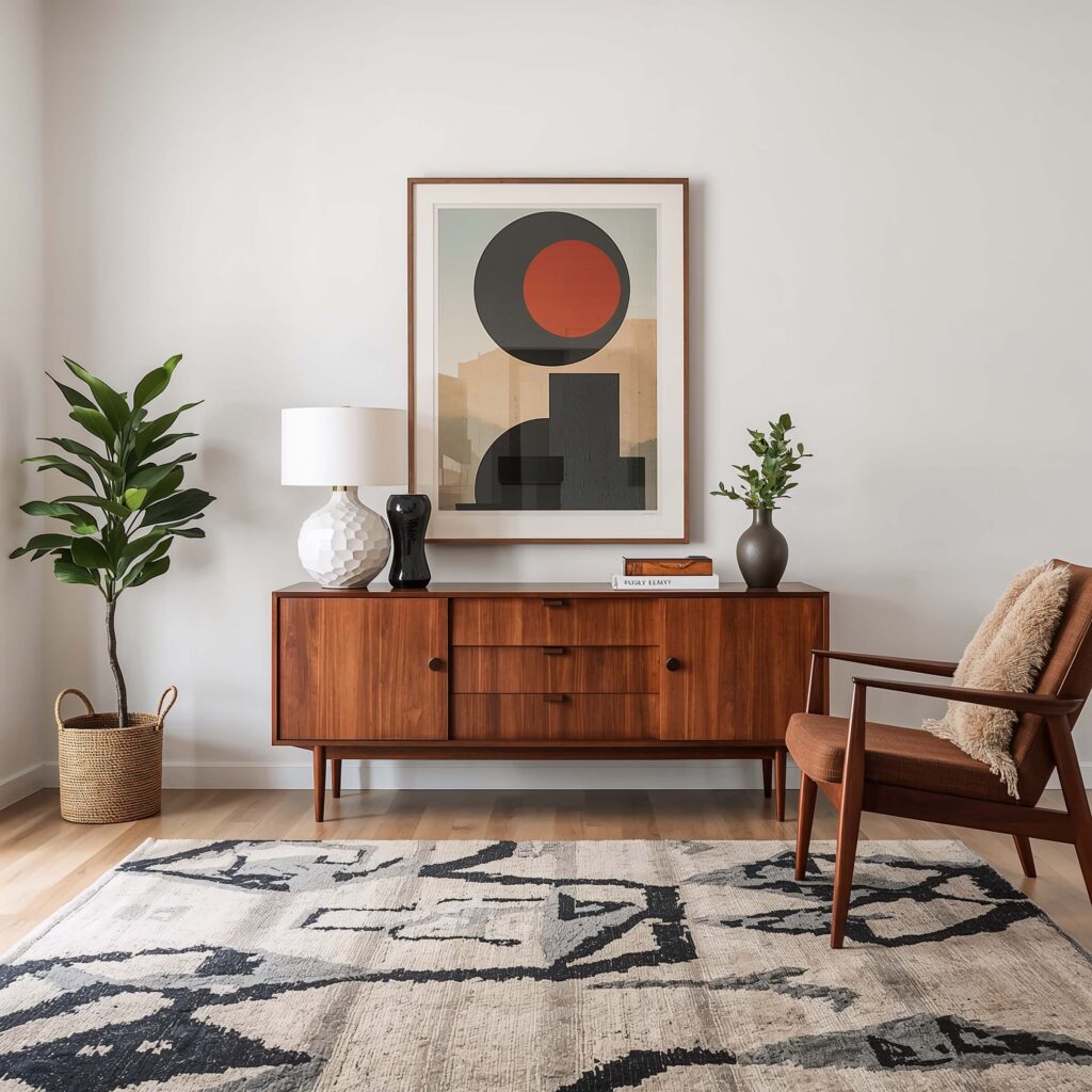 Here’s where you can really have some fun. While the rest of your mid century modern living room might lean neutral, your rug is where you can inject serious personality.