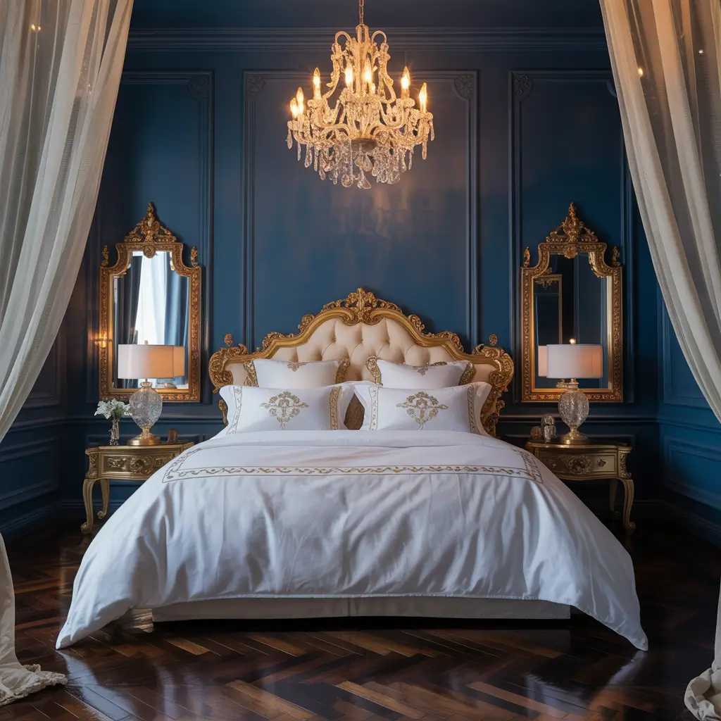 Elegant Midnight Blue and Gold Bedroom