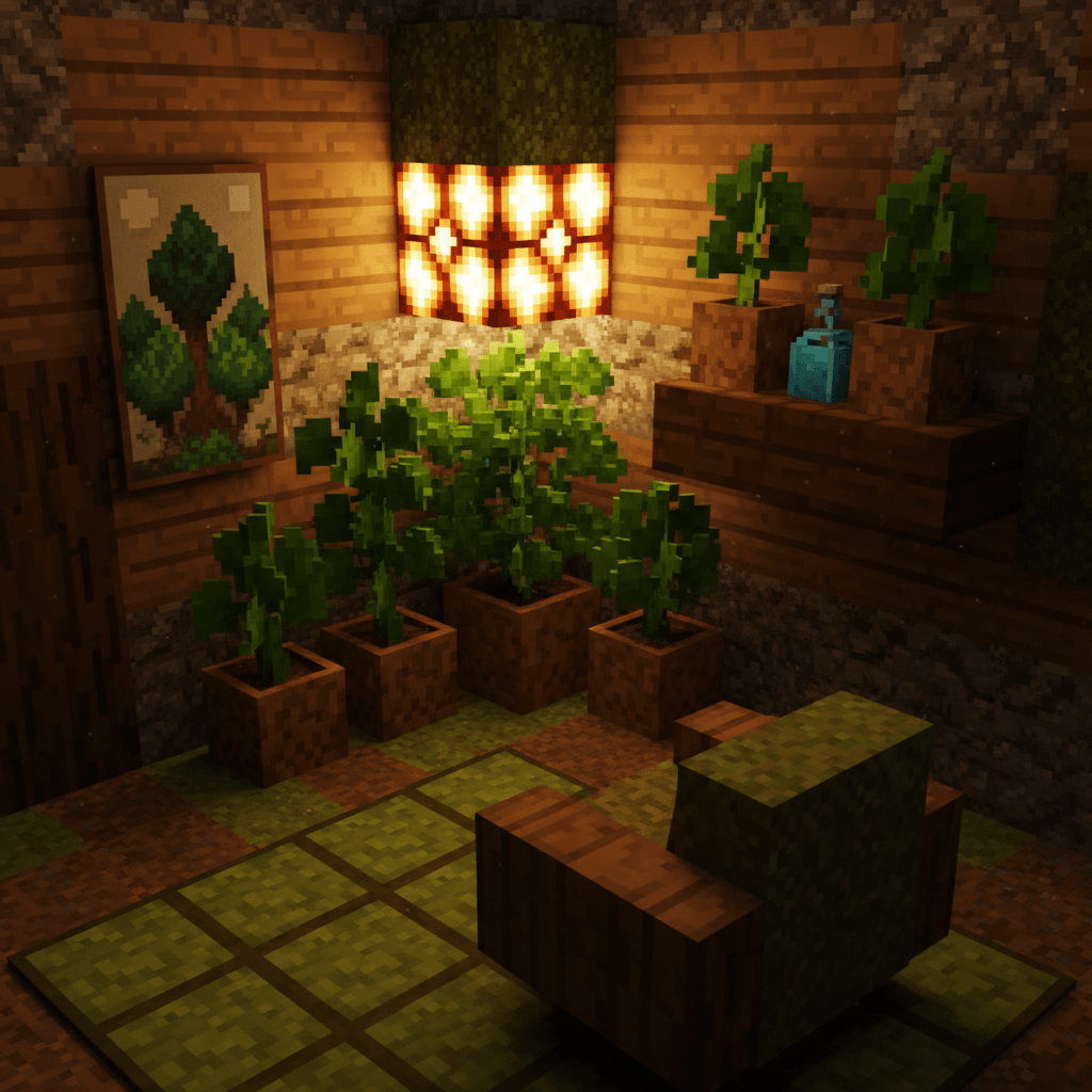 • Glowstone-Lit Plant Corners + Pixel Fern Shelf Arrangement for peak cozy.