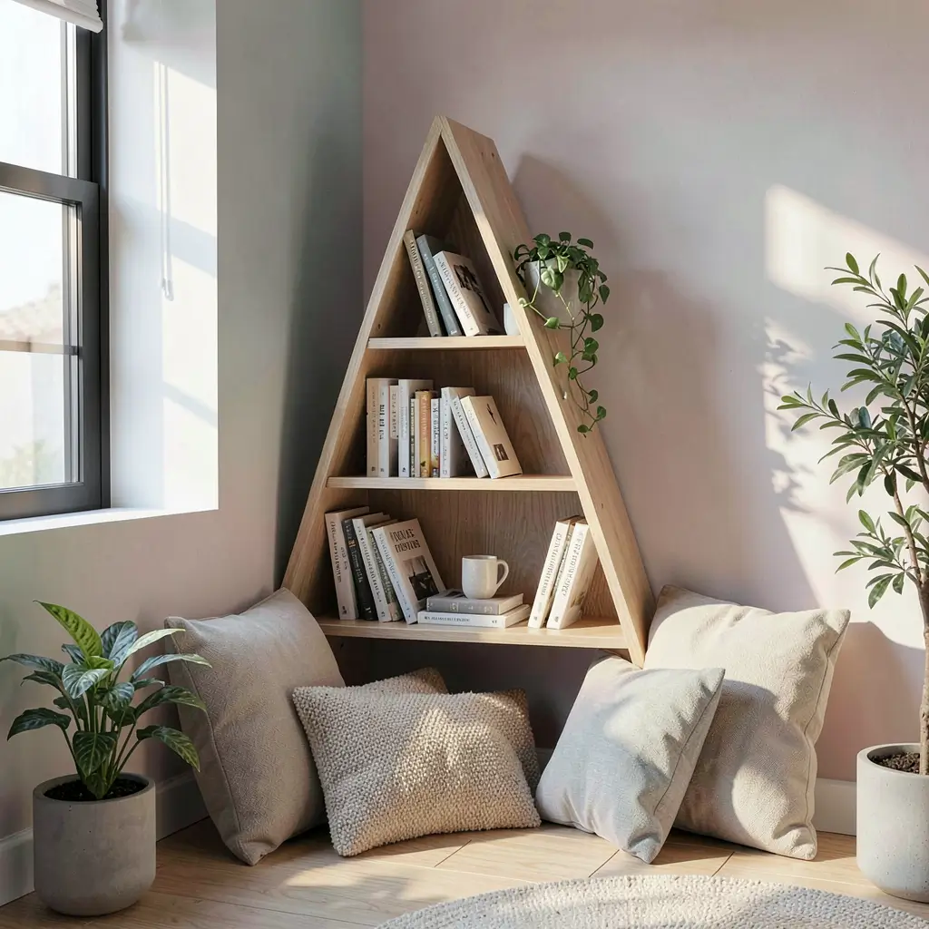 Corner mini bookshelves solve the eternal problem of what to do with those triangular dead zones. I’ve tried plants, floor lamps, and even a meditation cushion in corners, but nothing works quite like a perfectly fitted corner shelf.