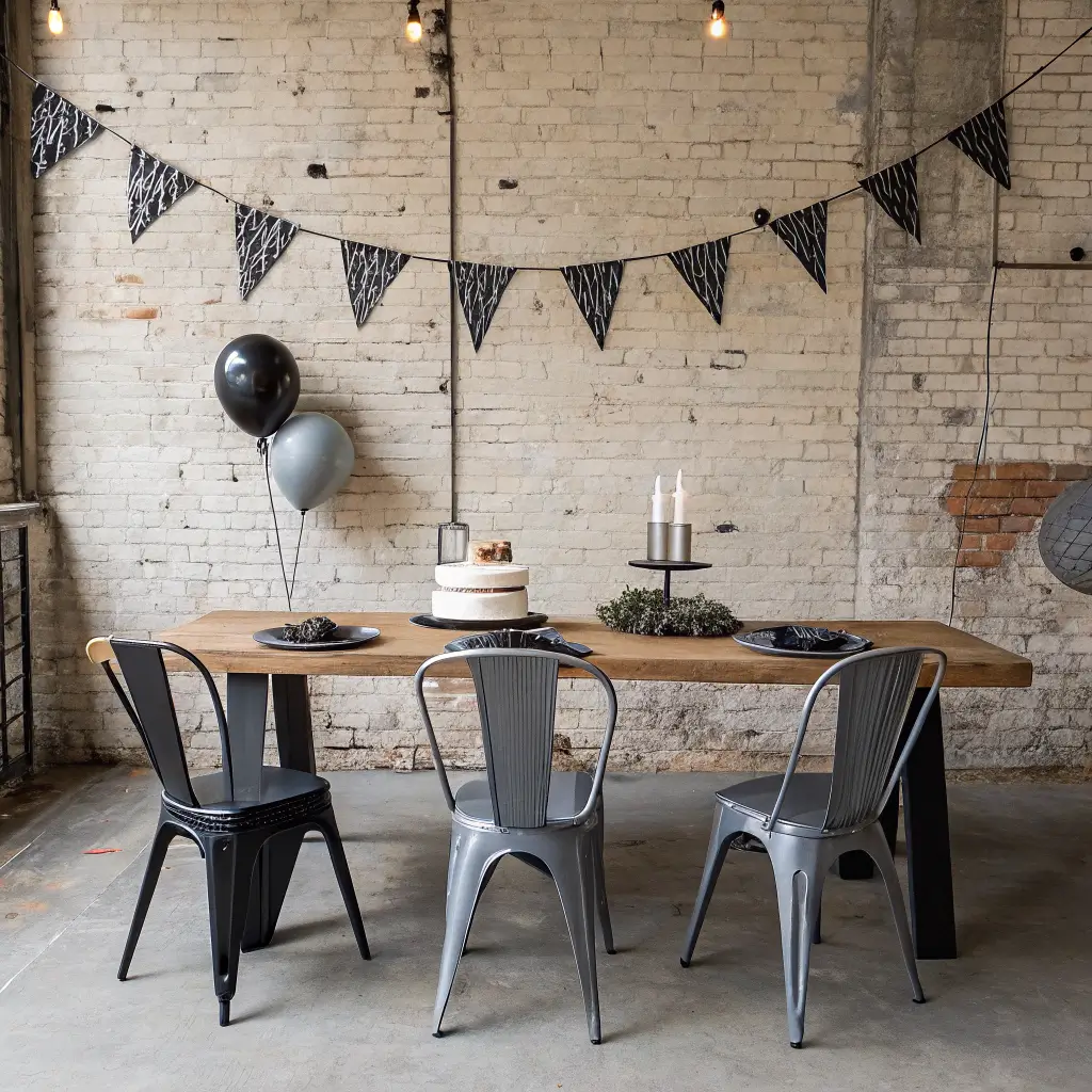 If you want a birthday setup that feels masculine, modern, and effortlessly cool, try an industrial loft-style table setup. This look mixes raw textures with clean lines. Think wood, metal, concrete tones, and simple table styling.