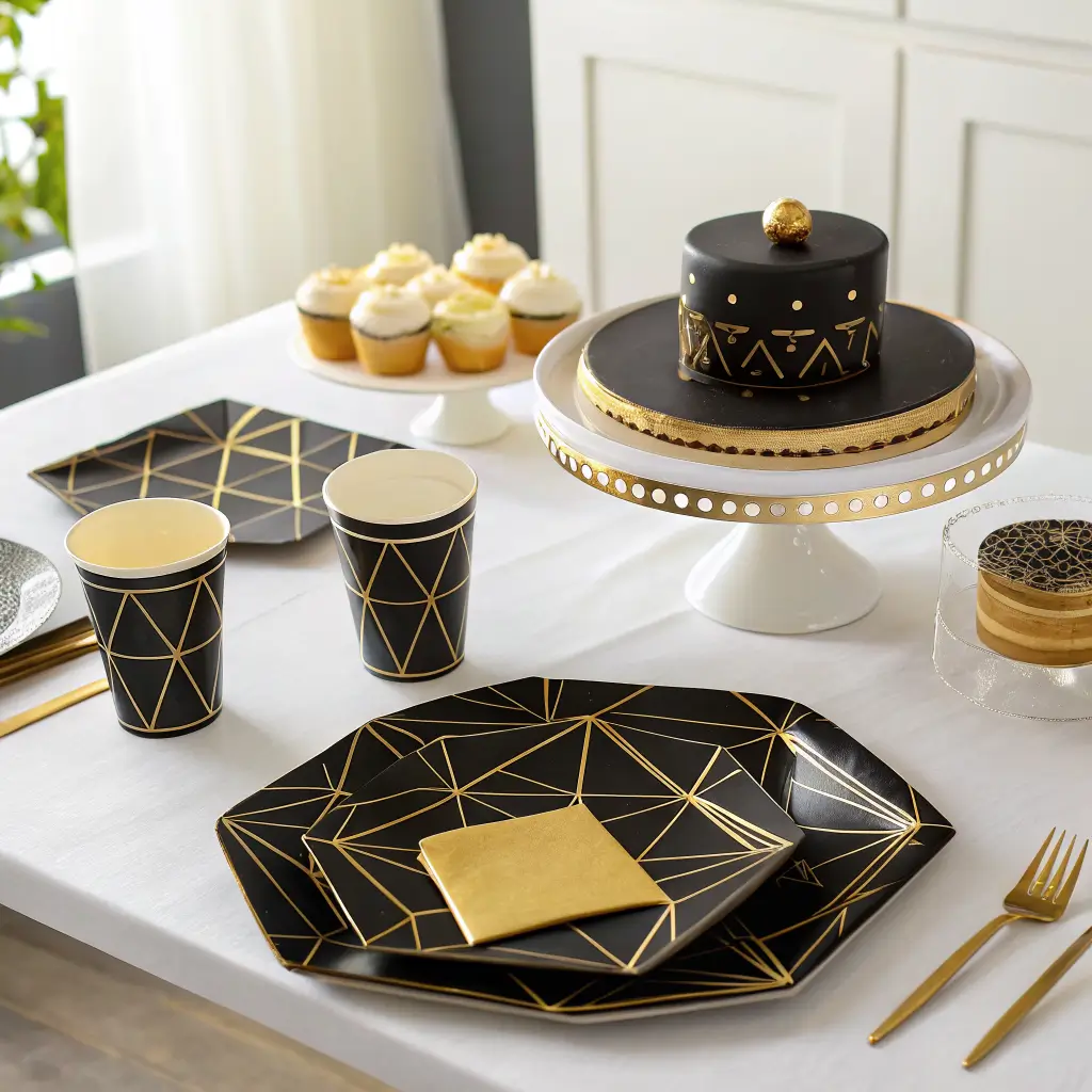 You can never go wrong with black and gold minimalist tableware. This combo feels bold, masculine, and refined. It instantly upgrades even the simplest birthday dinner.