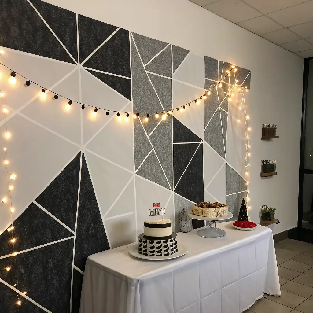 geometric wall backdrop with LED lights gives you a modern visual anchor for the whole party. This idea works great behind the cake table, gift area, or main photo spot. It feels structured, stylish, and very Instagram-friendly without being too trendy.