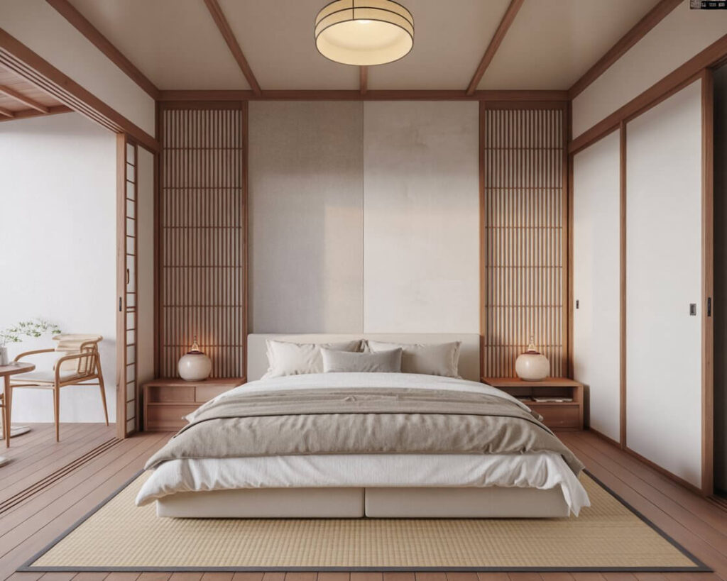Natural materials, floor-level living, and negative space are core principles here. Your bedroom becomes a place for rest and reflection, not just sleep.