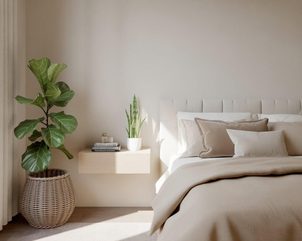 I keep a single fiddle leaf fig in the corner and a small snake plant on my floating nightstand. That’s it. They add organic shapes and improve air quality without turning my bedroom into a jungle.