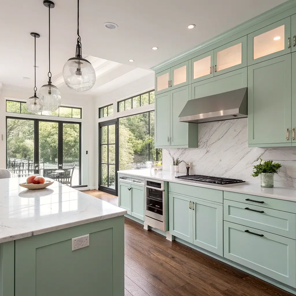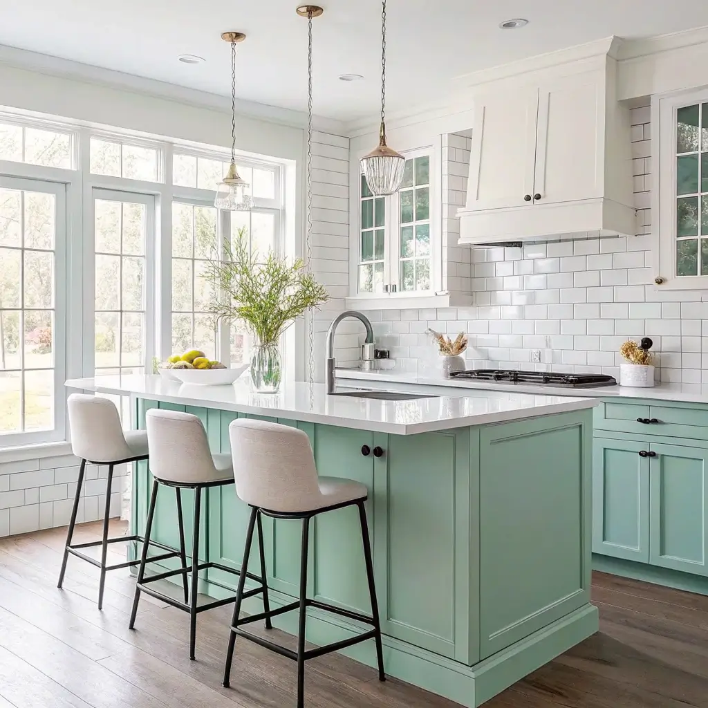 Pair mint with ocean-inspired hues. Soft blues, sandy beiges, and crisp whites all work beautifully. The key is keeping everything light and airy—no heavy, dark colors allowed in coastal mint kitchens.