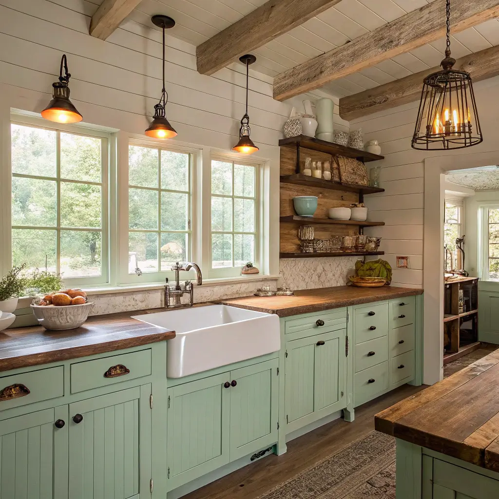 2. Rustic Charm with Mint Green Cabinets