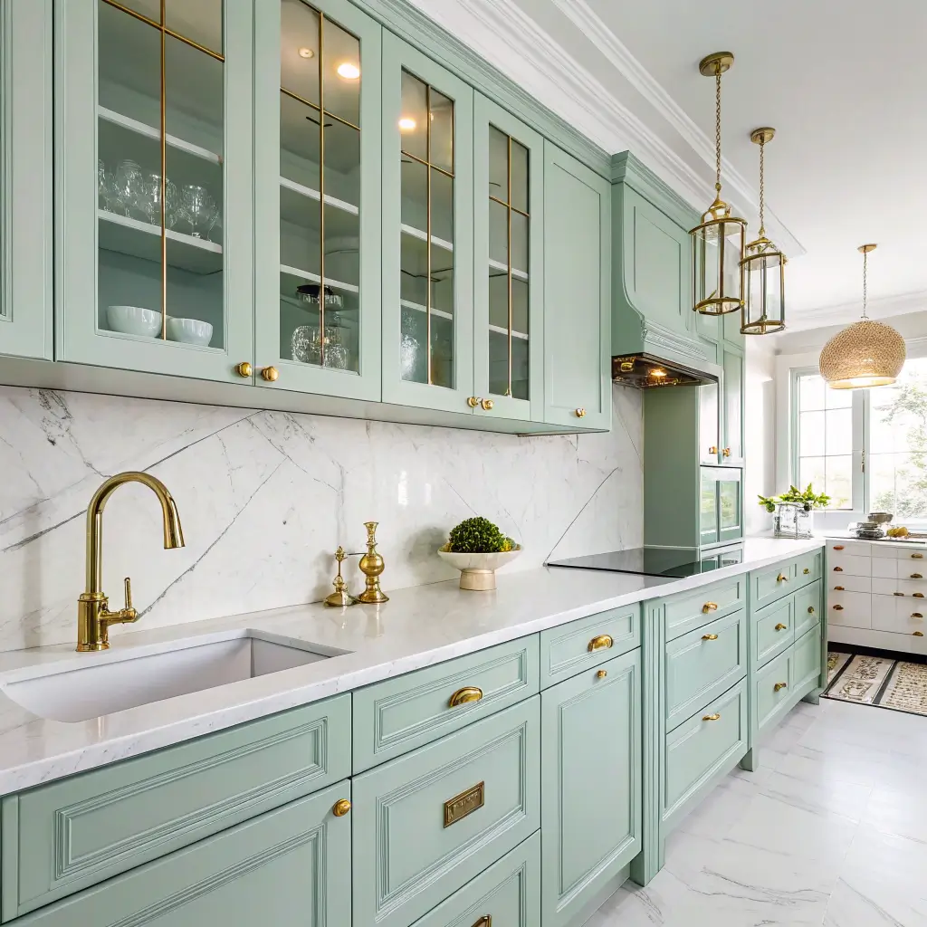 Mint and gold together create pure kitchen jewelry. This combination brings unexpected glamour that makes even builder-grade cabinets look custom.