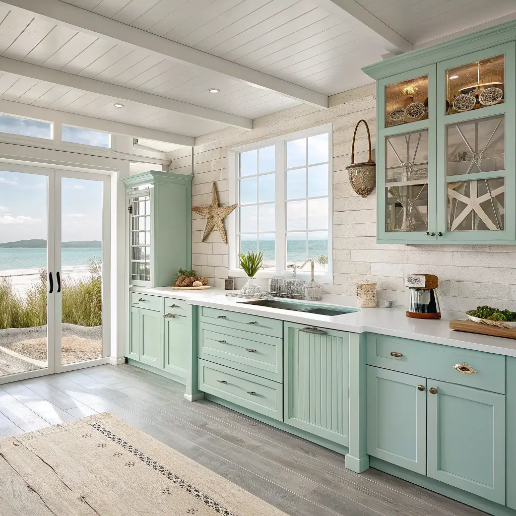 Coastal mint kitchens combine ocean-inspired colors with relaxed styling. Think weathered finishes, natural textures, and plenty of light. It’s basically permanent vacation mode.