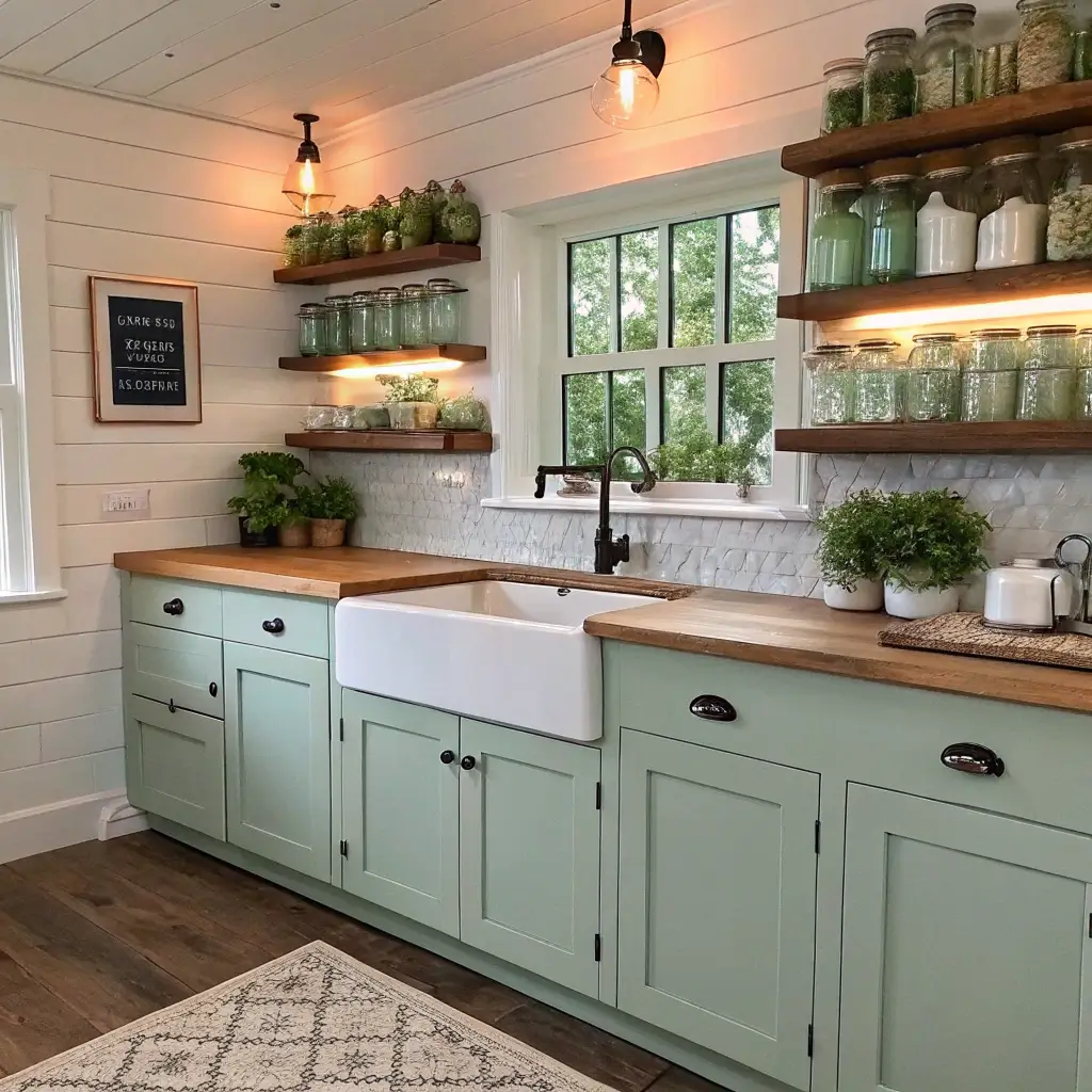Forget all-white farmhouse kitchens—mint brings personality while maintaining farmhouse charm. Shaker-style doors in mint, apron-front sinks, and barn-door pantries create updated farmhouse perfection.