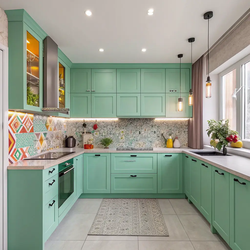 Every inch counts in small mint kitchens. Pull-out drawers, corner solutions, and magnetic knife strips maximize function. The cheerful color distracts from the compact size—it’s design psychology at its finest!
