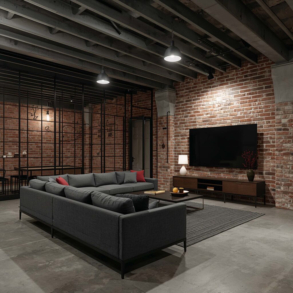 Now we’re talking! Industrial design brings that cool, edgy vibe that makes everyone ask, “Did you hire a designer?” (Spoiler: you didn’t.) This style embraces the basement’s natural elements instead of hiding them.