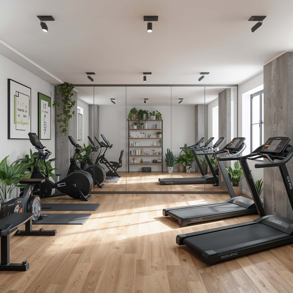 Mirrors aren’t just for checking form – they double the visual space and reflect light throughout the room. Mount them on at least two walls. Add a sound system because working out to tinny phone speakers is just sad.