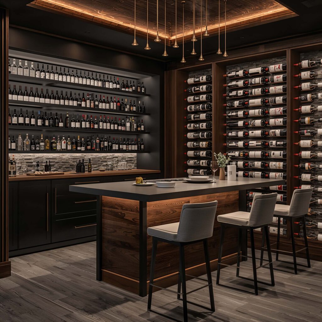 Temperature control matters more here than anywhere else in your basement. Wine needs consistent cool temperatures, while your bar area should feel comfortable for guests. Install a dual-zone system if you’re serious about wine storage.