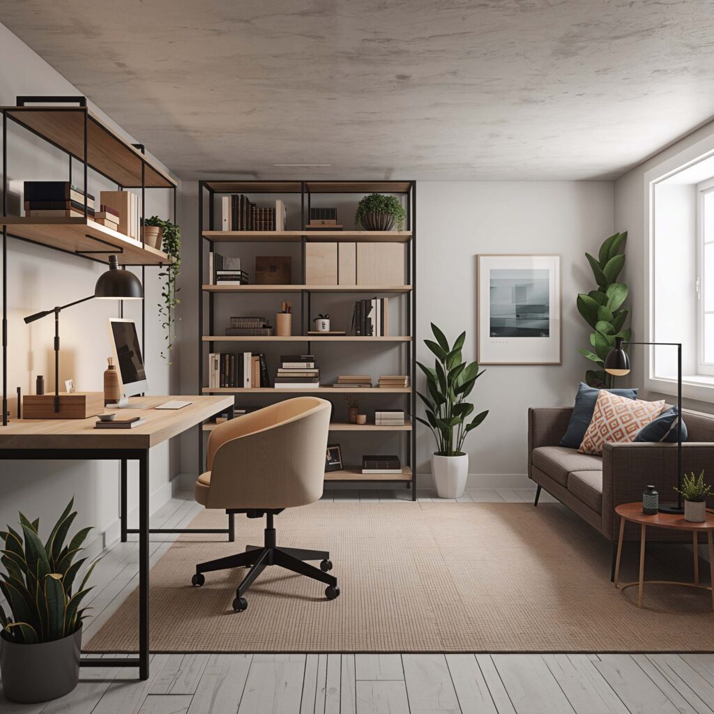 Include a comfortable seating area away from your desk. Sometimes you need to think away from screens. Add plants – they improve air quality and make the space feel less basement-like.