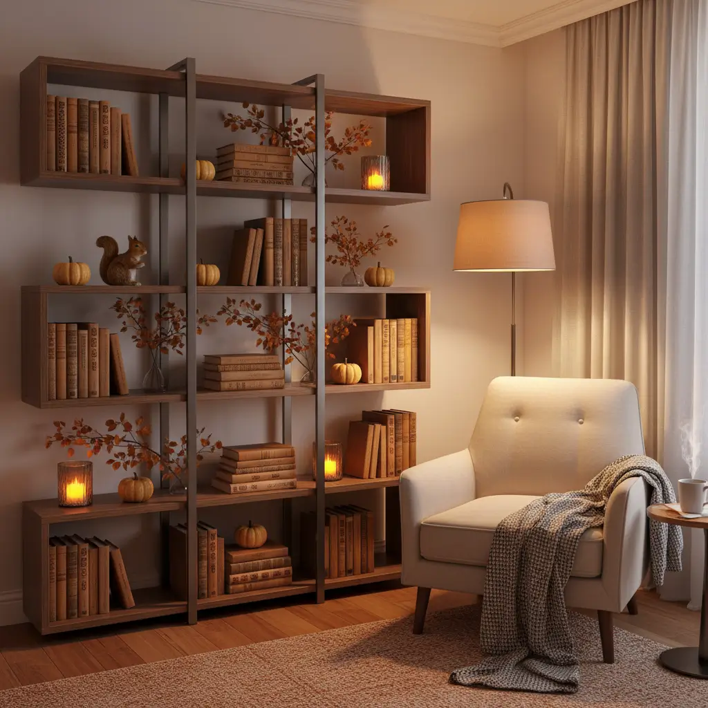 The seasonal secret? Small changes make big impact when thoughtfully placed. One pumpkin doesn’t scream fall, but a carefully styled autumn vignette on your bookshelf does.