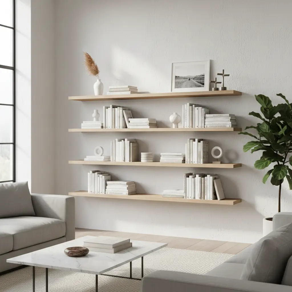 Arrangement patterns matter more with floating shelves. I create visual rhythm by alternating shelf lengths – long, short, medium – which prevents that ladder-to-nowhere look. The negative space between shelves becomes as important as what’s on them.