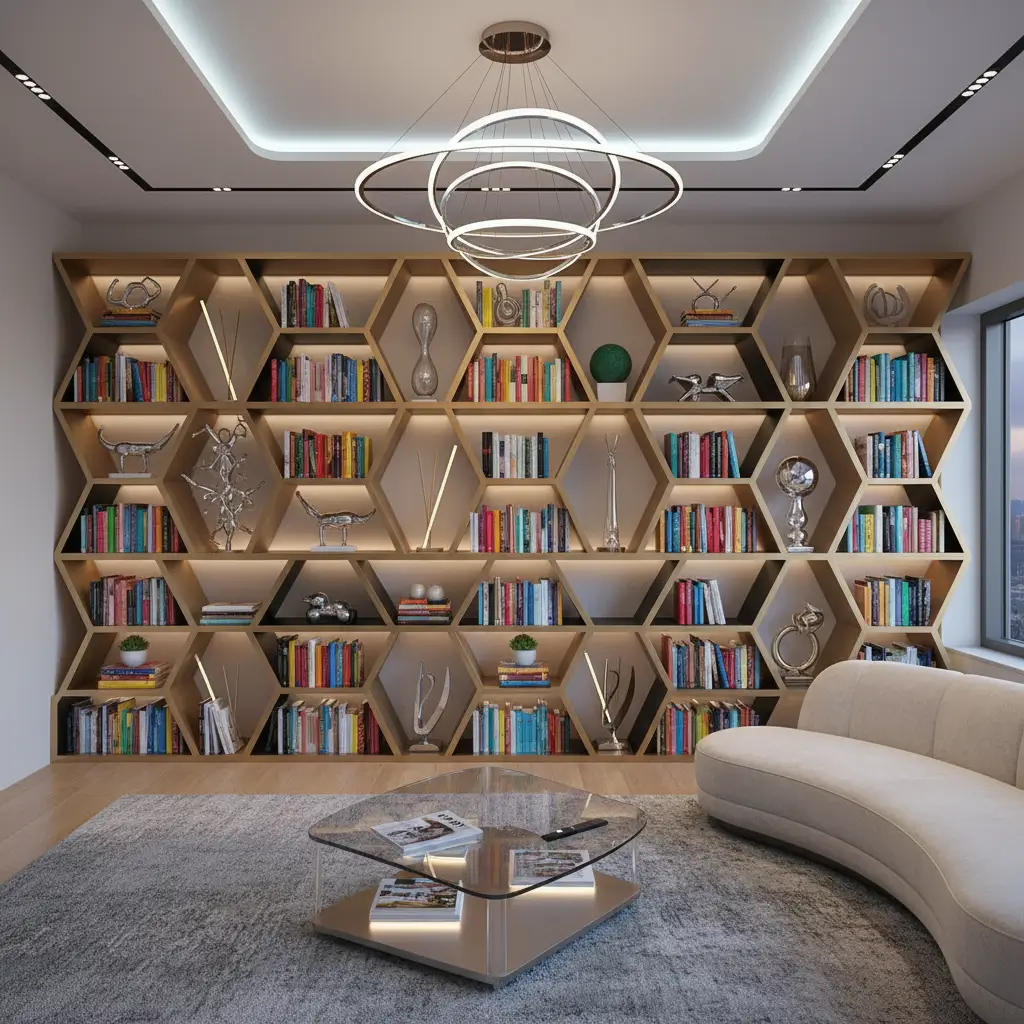 The key to geometric arrangements lies in purposeful patterns. I arrange books and objects to either echo or contrast the shelf shape. In my hexagonal unit, I place round objects to soften angles, creating visual tension that keeps eyes moving.