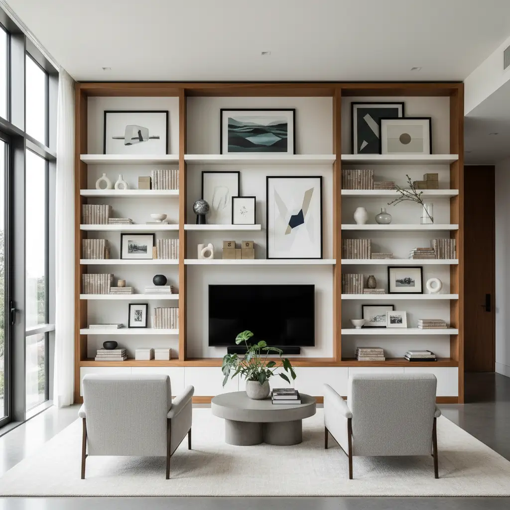Layering creates depth with art integration. I lean larger pieces against the back wall, stack books horizontally in front, then add small framed pieces propped against books. Each shelf becomes a composed still life rather than storage.