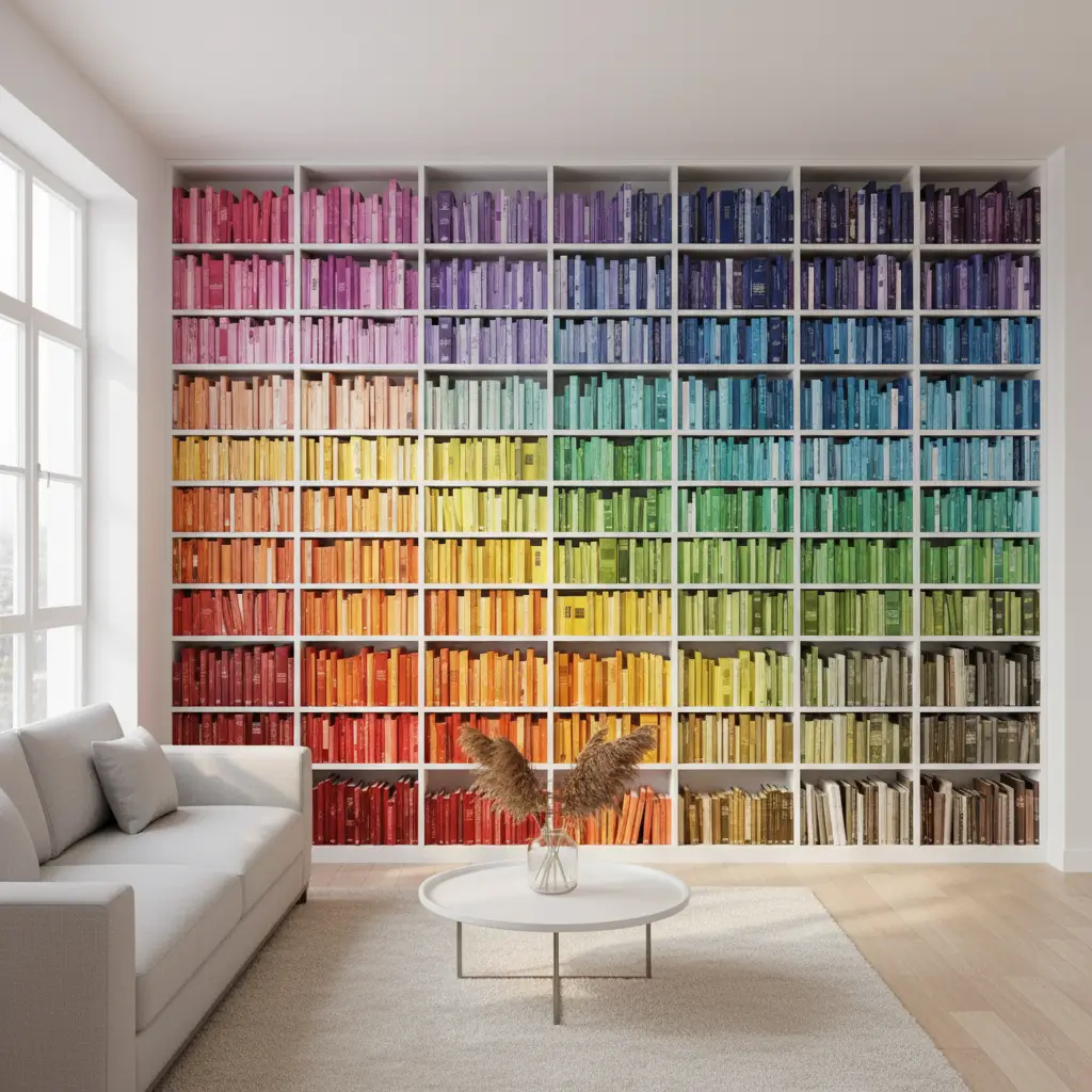 The rainbow method requires commitment and sufficient volume. You need enough books in each color to create visible blocks. My first attempt with 100 books looked patchy, but now with 300+, I’ve got a proper spectrum that could double as a paint store display.