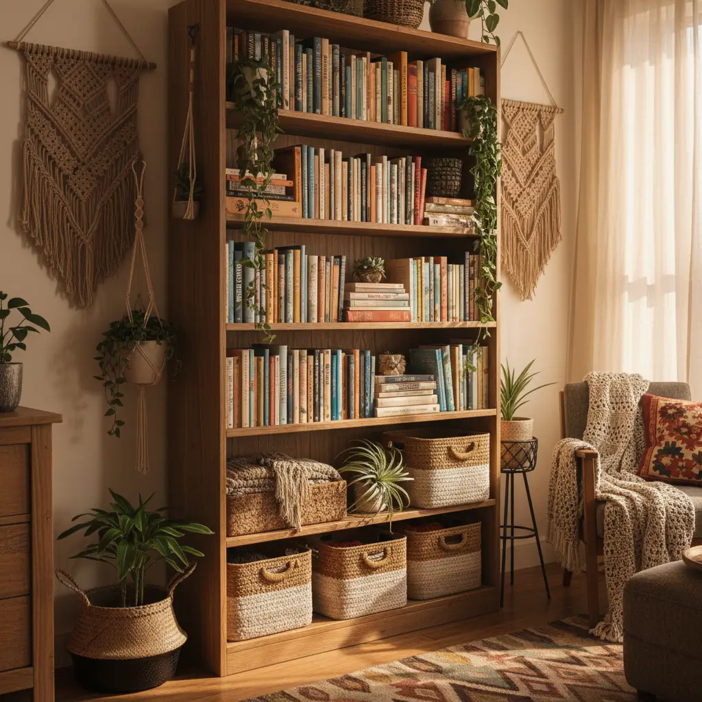 Boho bookshelf styling lets you display that rock collection from your gap year without looking like a geology museum. My boho journey started when I returned from Bali with seventeen woven baskets and needed somewhere to put them all. The bookshelf became my three-dimensional travel diary.
