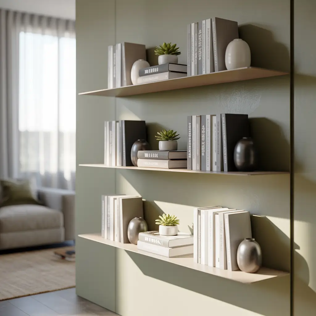 Create visual rhythm with repeated elements. I group books on every third section, plants every other section. This repetition creates flow rather than chaos.