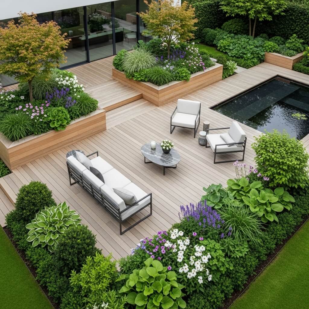- Multi-level design using raised planters or split-level decking