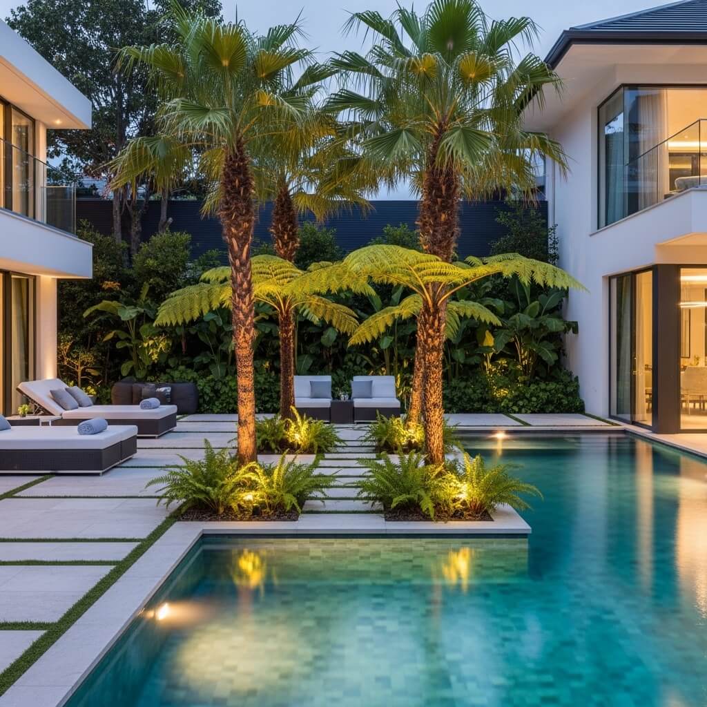 - Strategic palm trees or architectural plants for that resort vibe