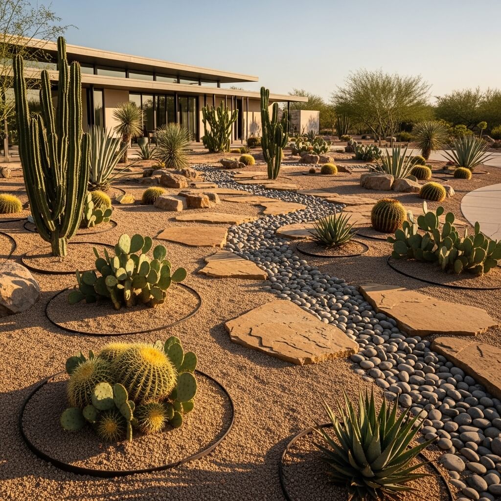 - Drought-tolerant plant palette—succulents, cacti, agaves, native grasses, and desert wildflowers