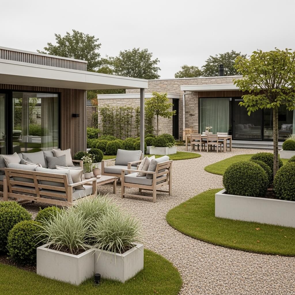 - Structured plants—boxwood spheres, clipped hedges, and architectural plants reinforce the geometry