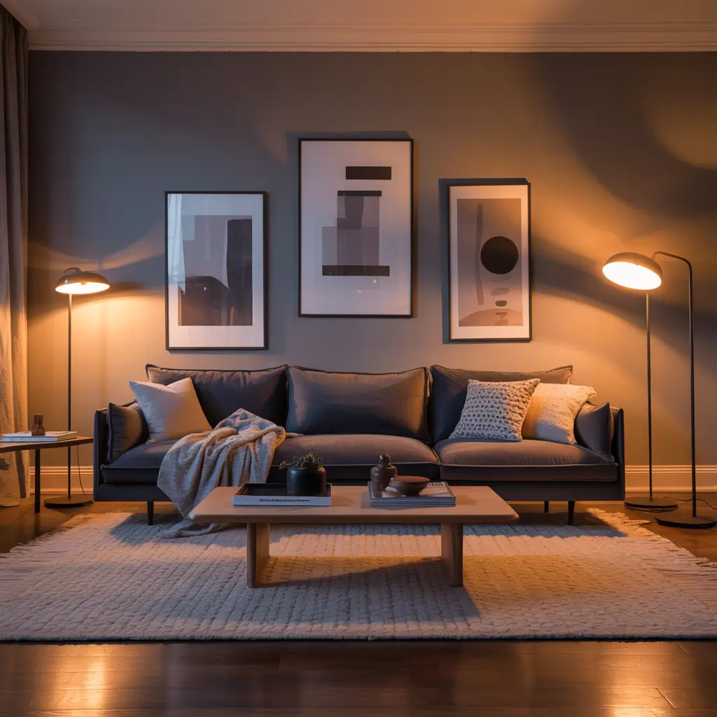 2. Cozy Modern Grey Living Room with Warm Lighting