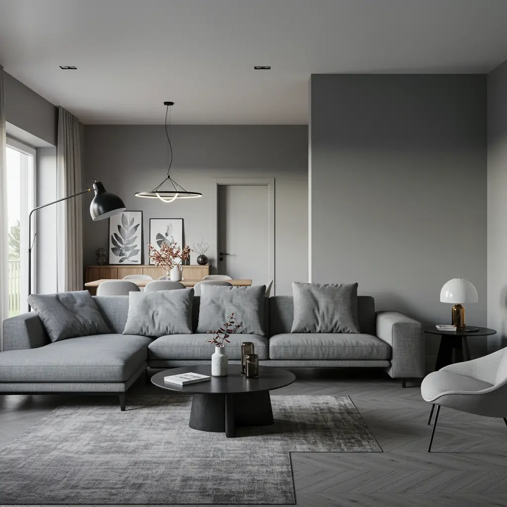 - Grey as primary neutral (sofa, accent wall, textiles)