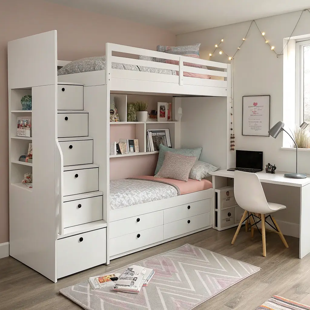 My kids’ modern bunk setup includes built-in LED reading lights, USB charging ports, and drawers integrated into the stairs. It looks like furniture from a Swedish design catalog but functions like a Swiss Army knife.