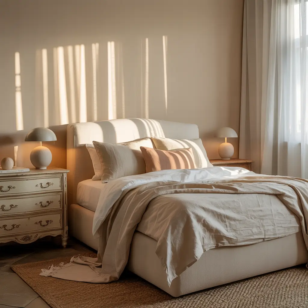 This is a fantastic way to create a room that feels both calm and full of personality. Start by creating a serene and timeless neutral bedroom—soft white walls, a simple beige upholstered bed, a natural fiber rug. It’s a beautiful, peaceful canvas.