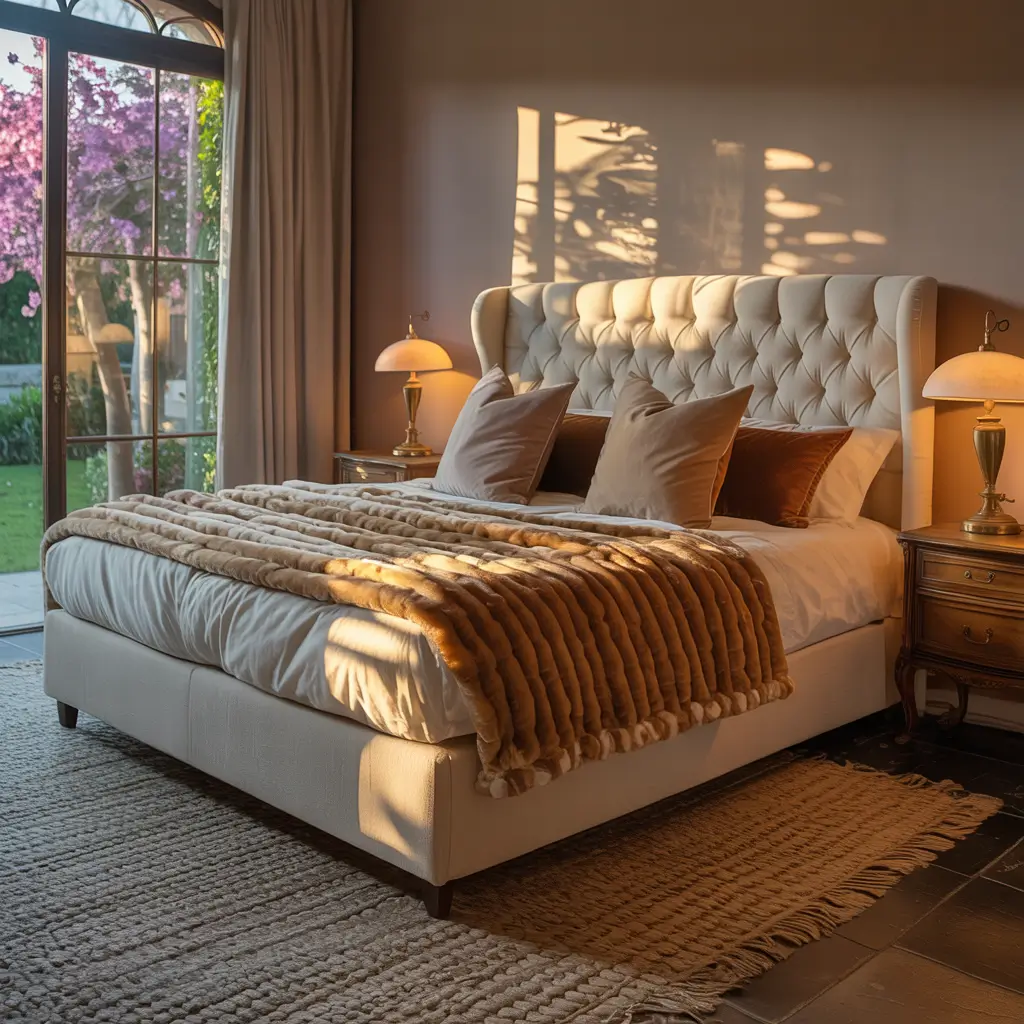 - The Luxe Base: Think a deep, moody wall color, a sumptuous velvet upholstered bed, and a thick, soft wool rug.
