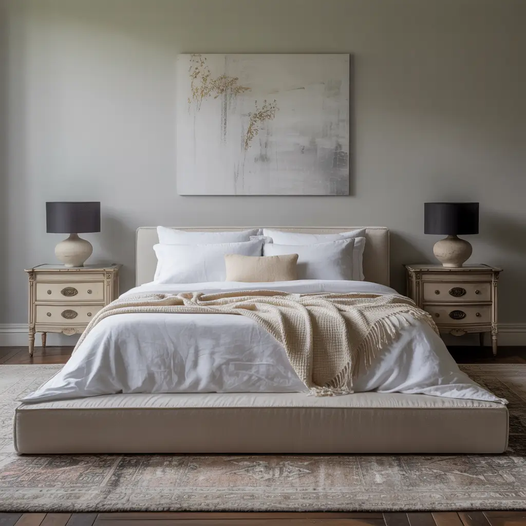 - The Modern Base: A neutral wall color (warm whites, soft greys, beiges), a simple modern bed frame, and a neutral, low-pile area rug.