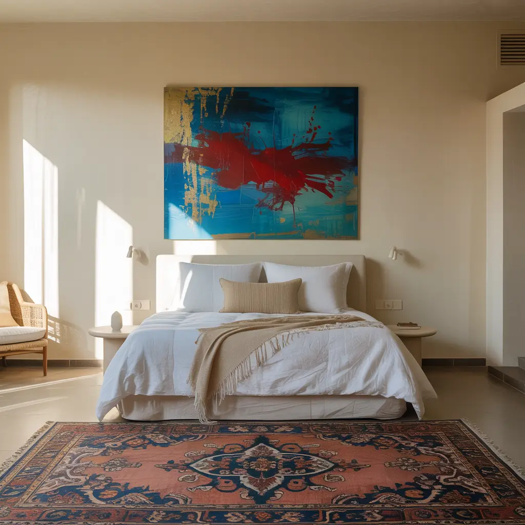 Now, for the punch: hang a single piece of large-scale, bold, modern art above the bed or on the main wall. It could be an abstract painting with vibrant colors, a graphic screenprint, or a dramatic black and white photograph.